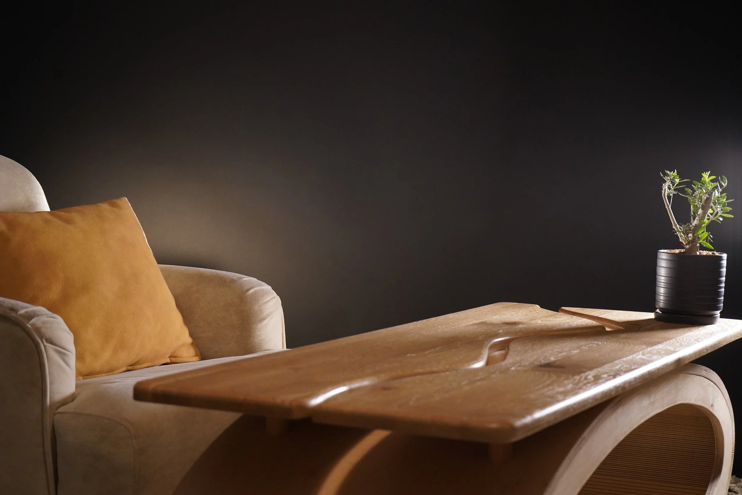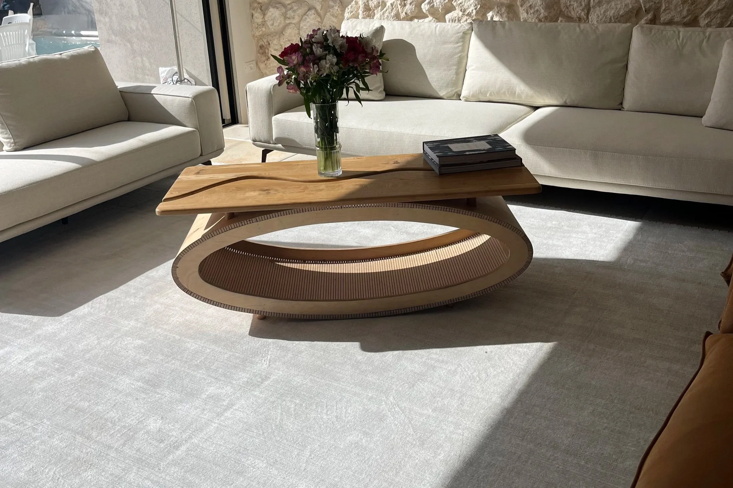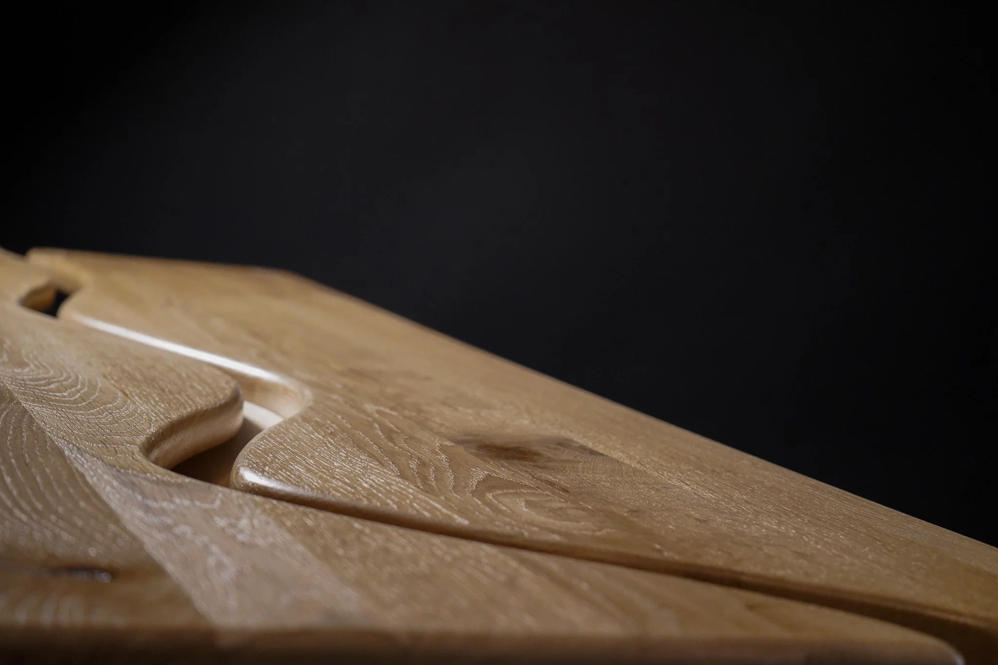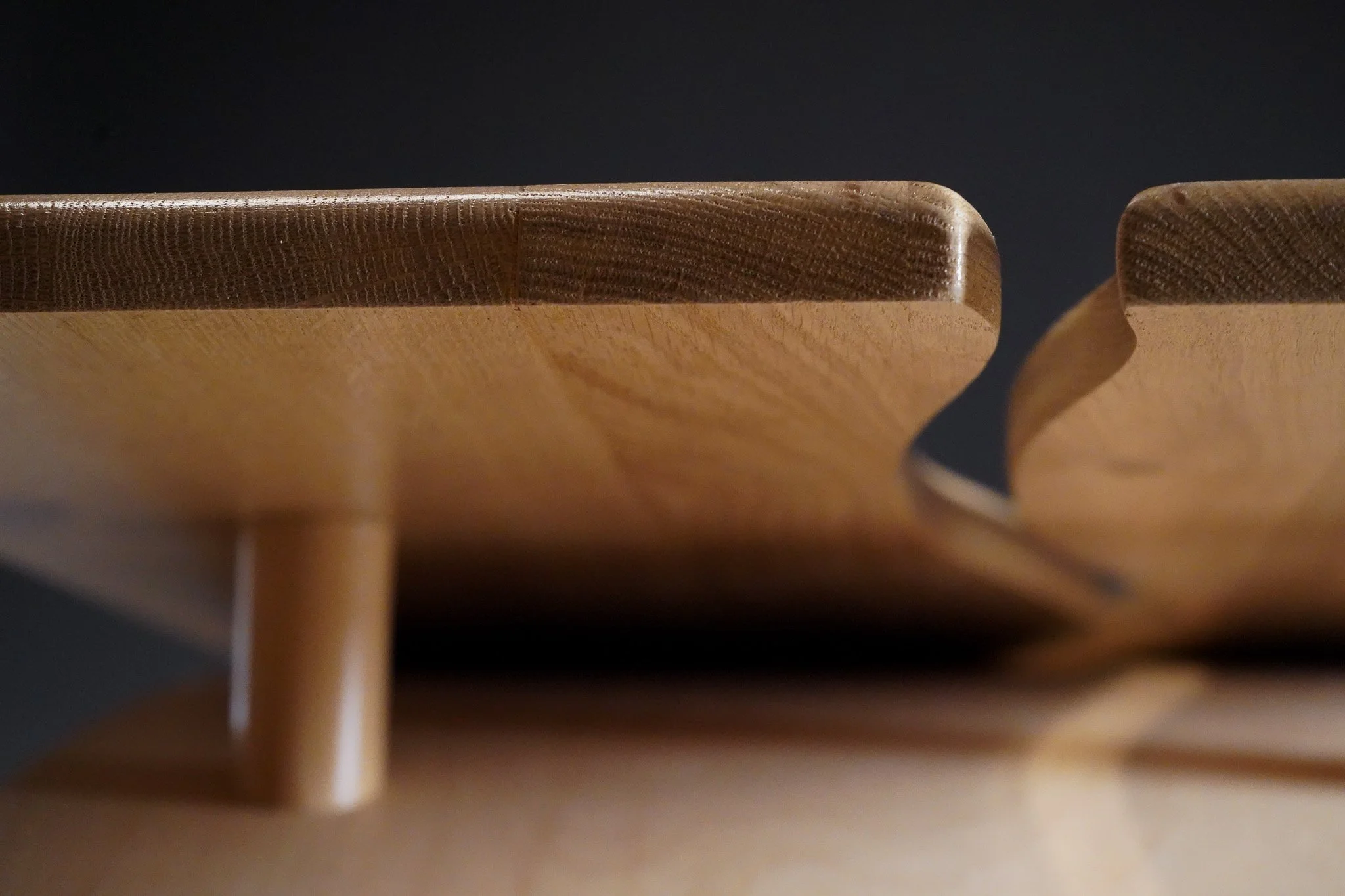 two solid oak slabs mirroring each other like water curving the banks of a river, balanced on birch plywood that was manipulated in to an oval shape by 300 groves which allow it to flex and mold in to its final position.